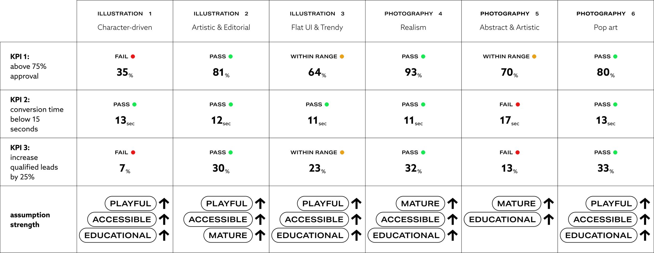 We let the approval rating and increase in qualified leads guide the major decision making, as the time to task was not as accurate of a measuring as this was a static prototype and not a live interaction with the actual app. Because we were measuring creative artwork, we wanted preference and approval to outweigh the other metrics.
