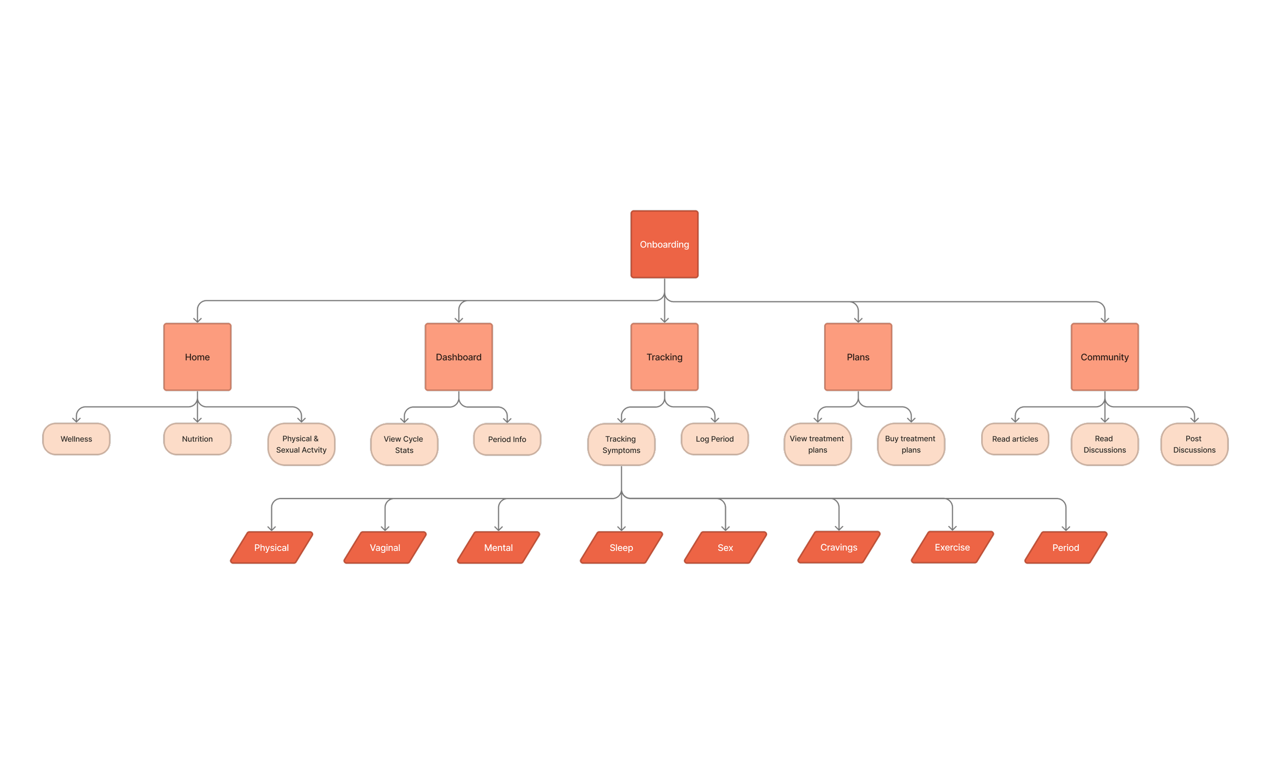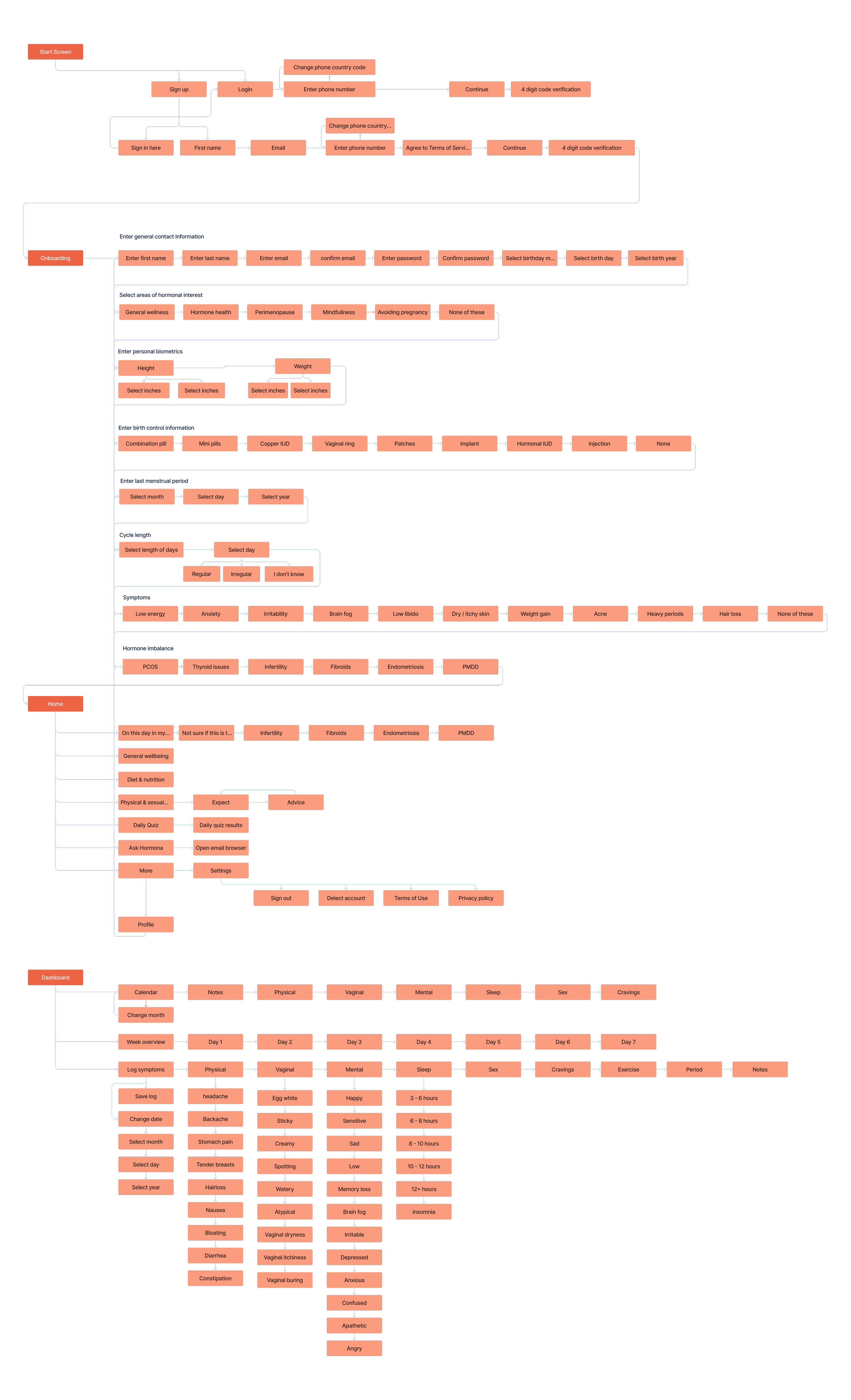 With the features defined, prioritized, and the specs articulated, the next step to bringing the Hormona app to life required creating an optimized and simplified organizational structure, that defined where consumers would expect to find information one might need, within the hierarchical order of navigation in the app.