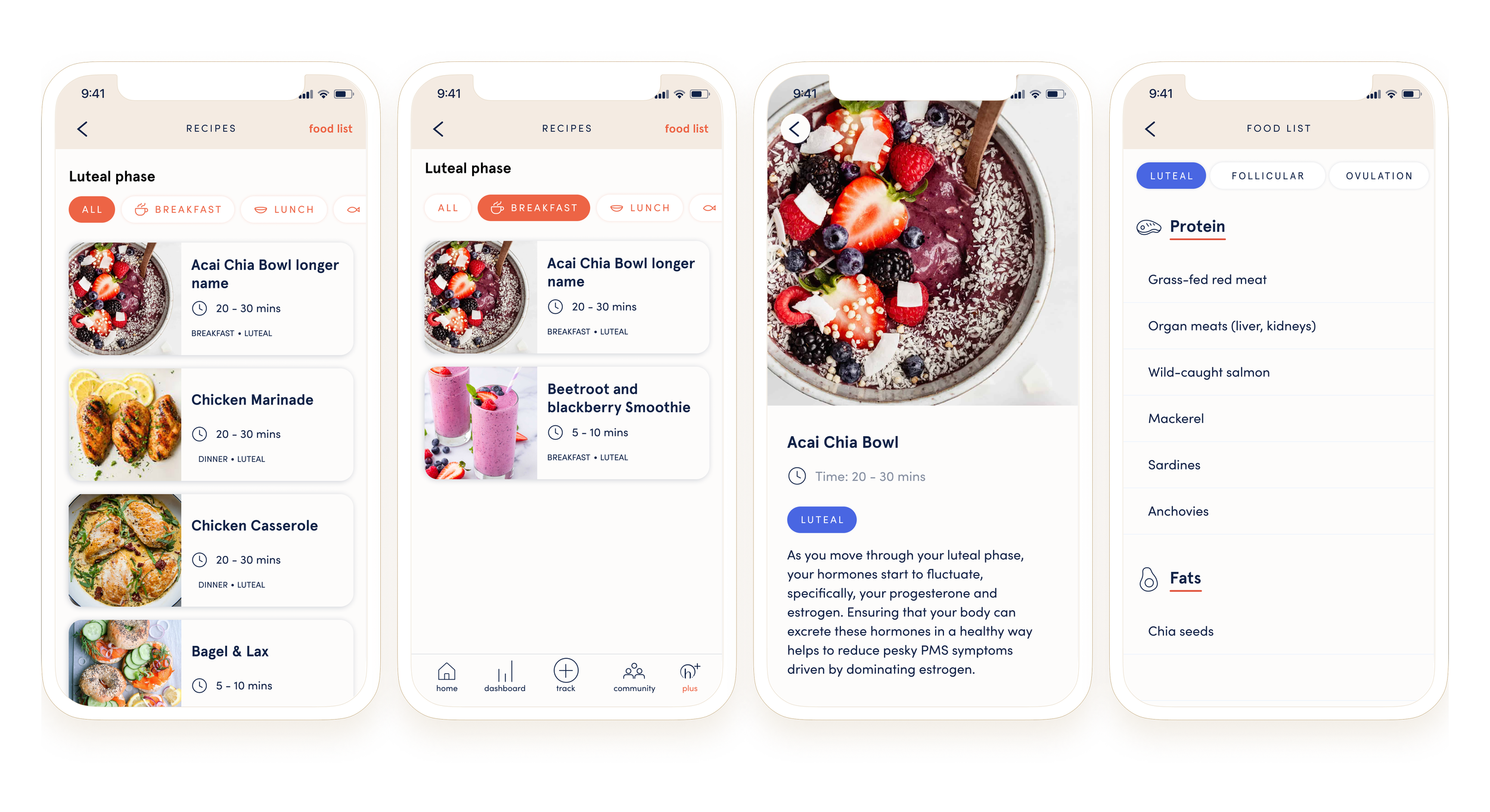 The key screens we wanted to test first were the offerings that we wanted to reserve exclusively for premium accounts. As it was paramount to show investors potential early revenue streams, we prioritized the development of the premium features, additionally as a way to gain intrigue from consumers. One of the early premium features we wanted to test, with minimal content development resources, were recipes & recommended unique foods to eat depending on the position within the menstrual cycle. I put together these screens, and interviewed 5 super users for quick qualitative feedback.
