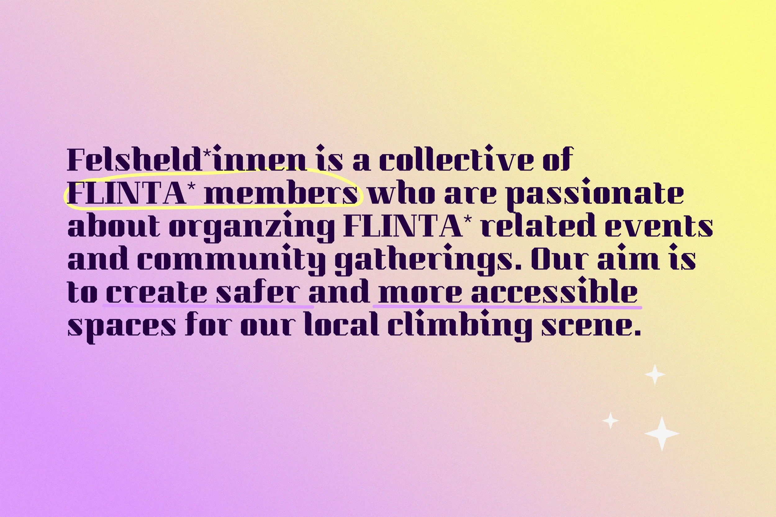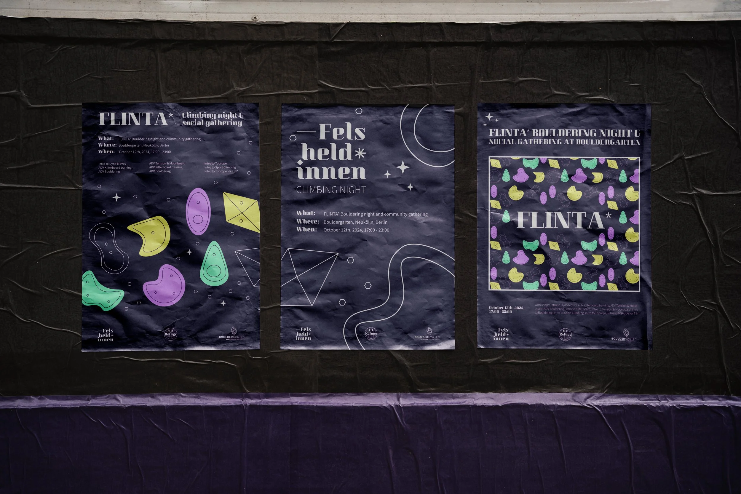 An immersive, slightly enchanted identity. A climbing gym transformed into collective ritual space. Conscious. Celebratory. Created with care at the forefront. Built by and for the FLINTA community, where visibility feels intentional and every ascent carries shared momentum.