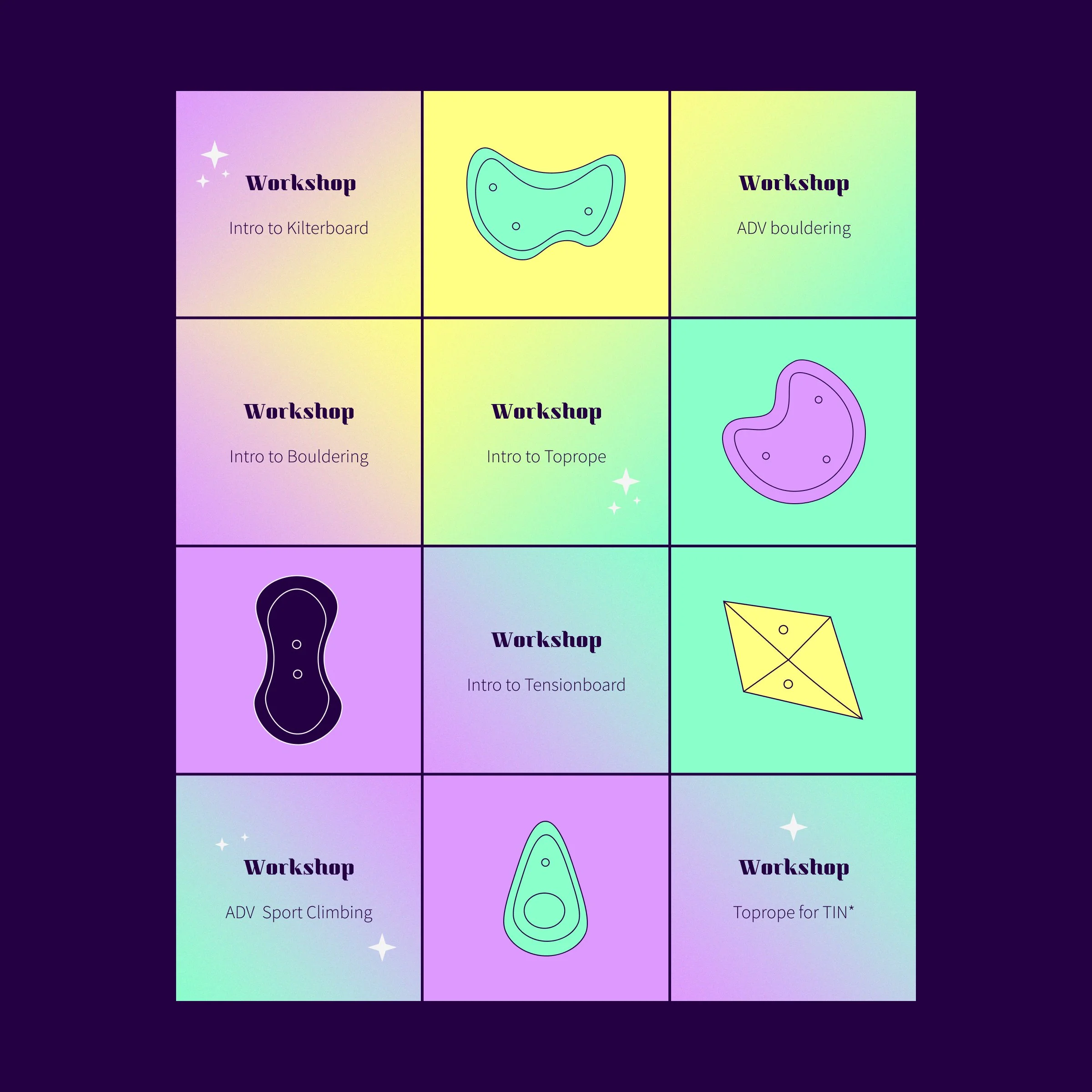 The system draws from the raw codes of climbing culture. Route tape, topo lines, chalk marks, grading symbols. These functional cues are reworked through a more atmospheric lens, infused with the twinkle of city nights and the intimacy of social gathering. Chalk dust becomes sparkling stars. Twilight gradients wash across concrete textures. Climbing holds float in soft, fluid planetary compositions, shifting from object to icon.
